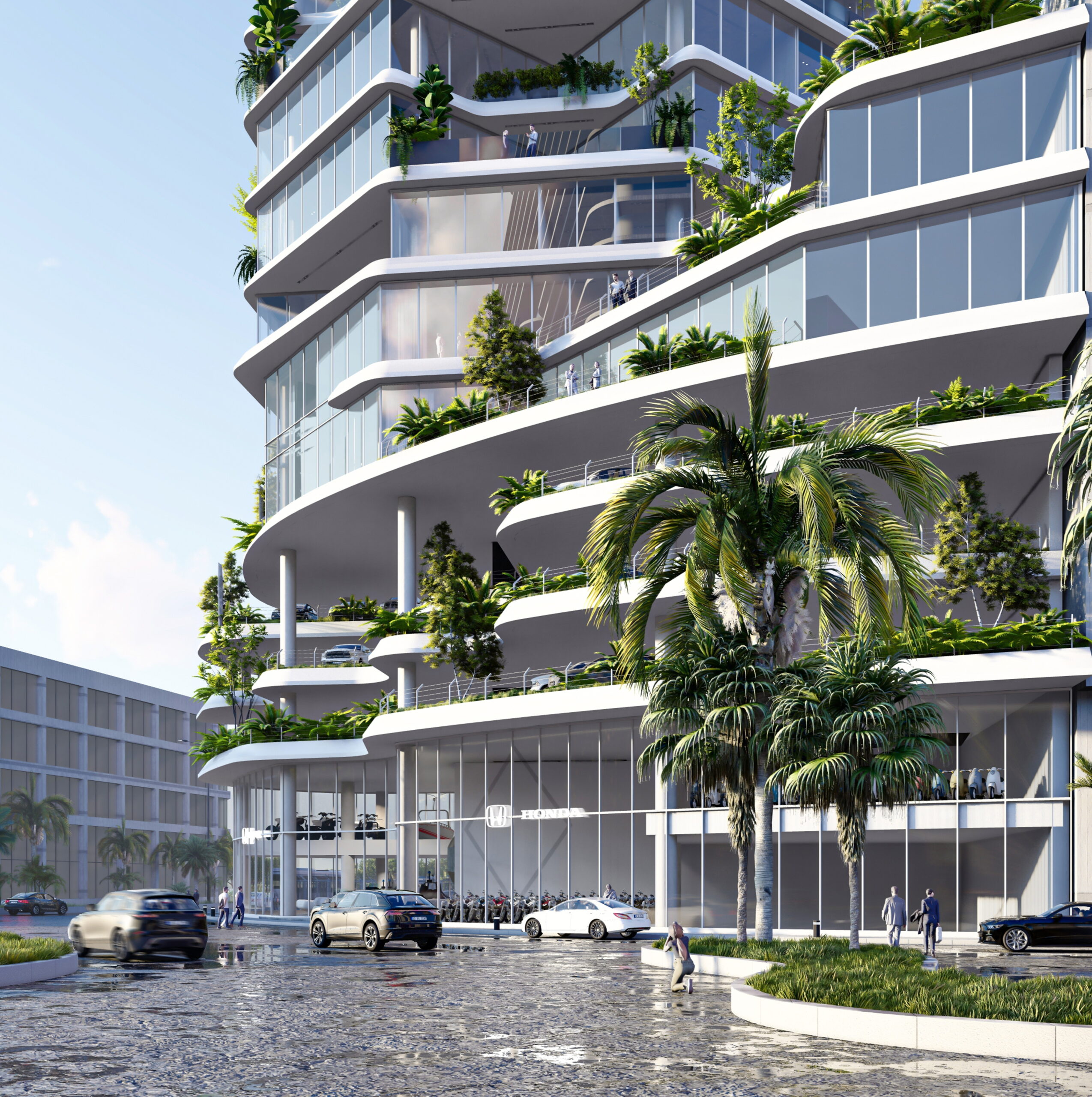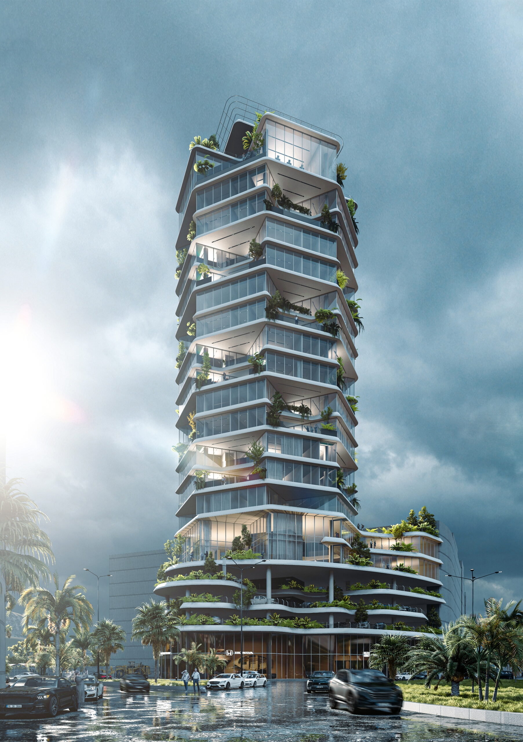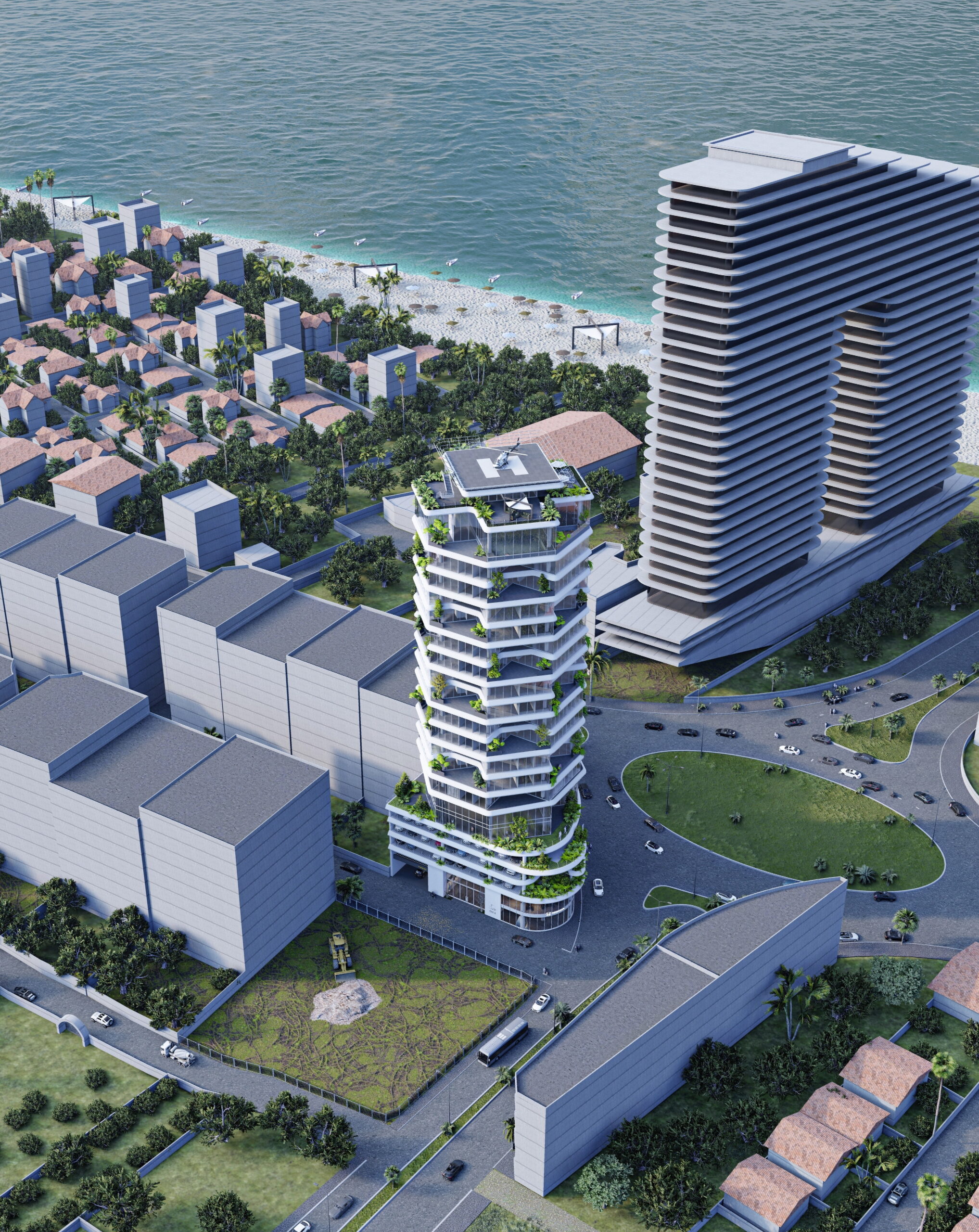 هر یک از واحدها یک تراس را در دل خود جای داده‌اند و بخش‌های عمومی و خصوصی واحدها حول این تراس‌ها قرار گرفته‌اند‌. به این ترتیب چشم انداز طبیعی محیط اطراف تا عمق پروژه نفوذ می‌کند و فرم L شکل واحدها امکان دید به دریا را برای واحدها تامین می‌کند.